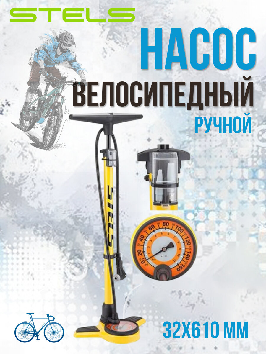 Насос для велосипеда напольный ручной STELS P32B-07 стальной с манометром желтый (item:030) 2 484 ₽