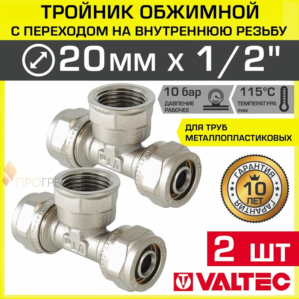 10 цен на 2 шт - Тройник обжимной 20 мм х 1/2" ВР х 20 мм для металлопластиковых труб 20(2,0) VALTEC / Латунный фитинг под обжим с переходом на внутреннюю резьбу ДУ15, арт. VTm.332.N.200420