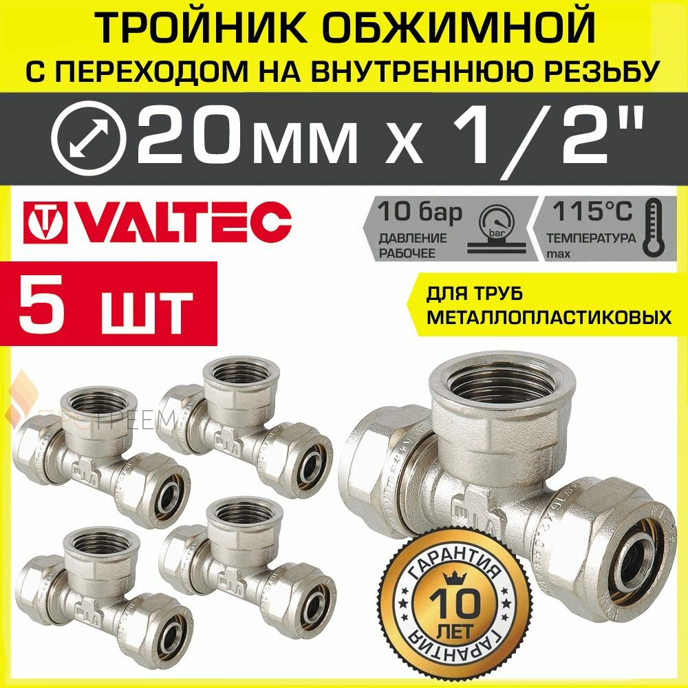10 цен на 5 шт - Тройник обжимной 20 мм х 1/2" ВР х 20 мм для металлопластиковых труб 20(2,0) VALTEC / Латунный фитинг под обжим с переходом на внутреннюю резьбу ДУ15, арт. VTm.332.N.200420