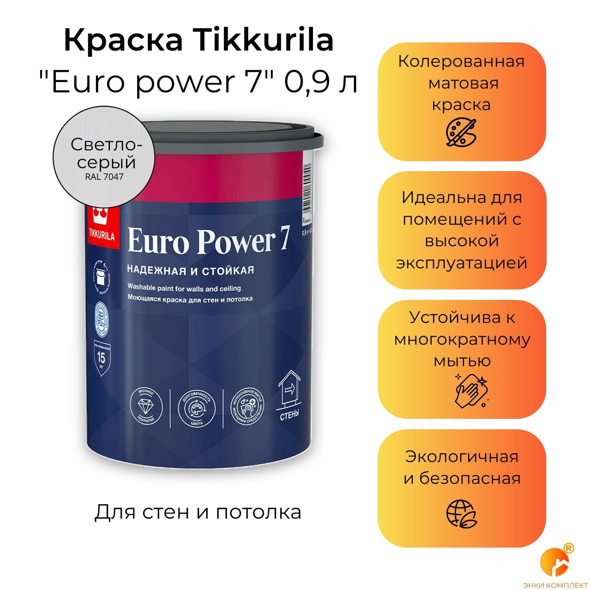 Краска моющаяся Tikkurila Euro Power 7 RAL 7035 (Светло-серый - Light grey) 0,9 л информация:
