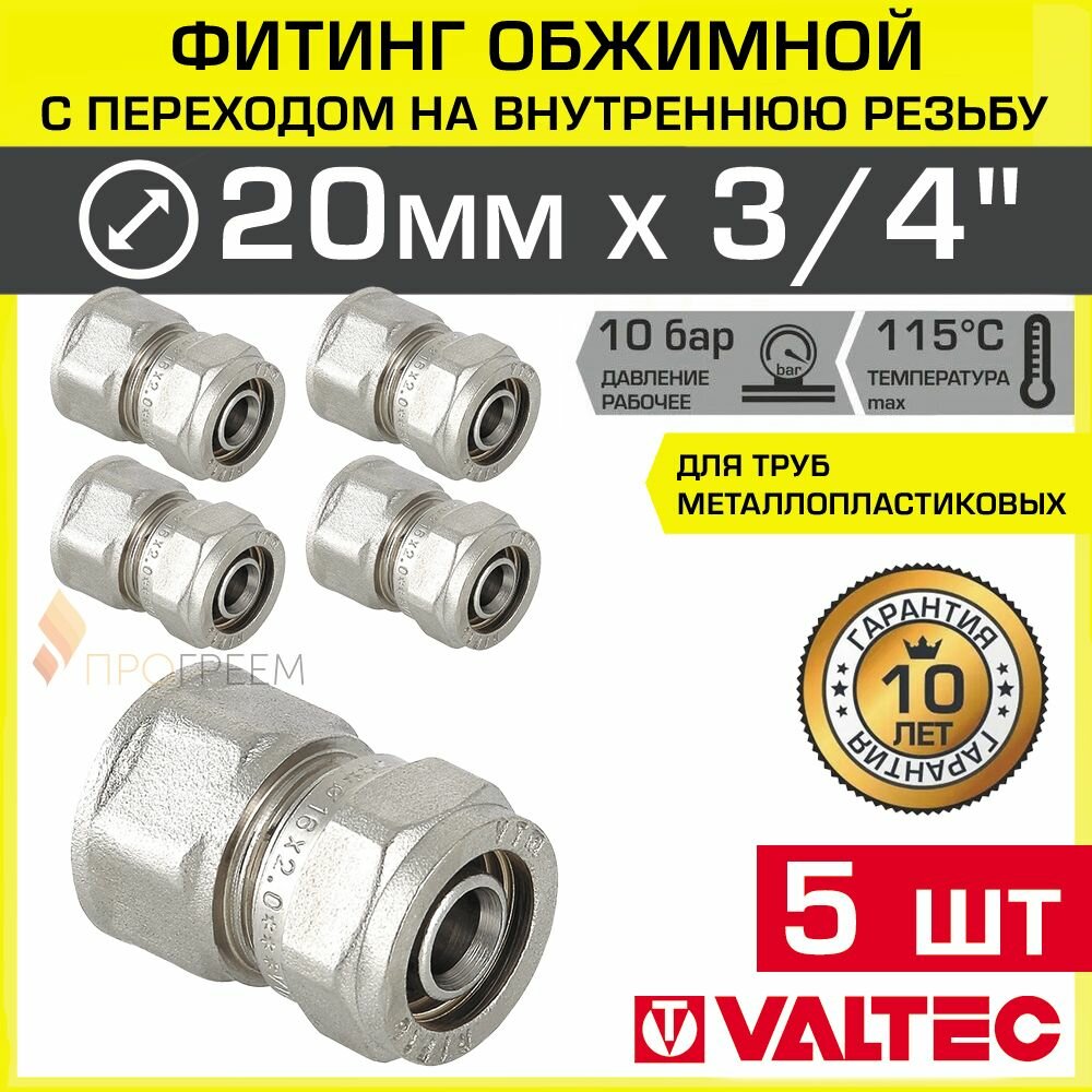 5 шт - Фитинг обжимной 20 мм х 3/4" вн.р. для металлопластиковых труб 20(2,0) VALTEC прямой / Латунное соединение под обжим с переходом на внутреннюю резьбу ДУ20, арт. VTm.302.N.002005 информация: