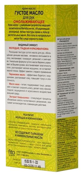 Масло для рук Fito косметик Густое масло для рук с персиковым маслом, маслом какао и экстрактом боярышника «Омолаживающее» информация: