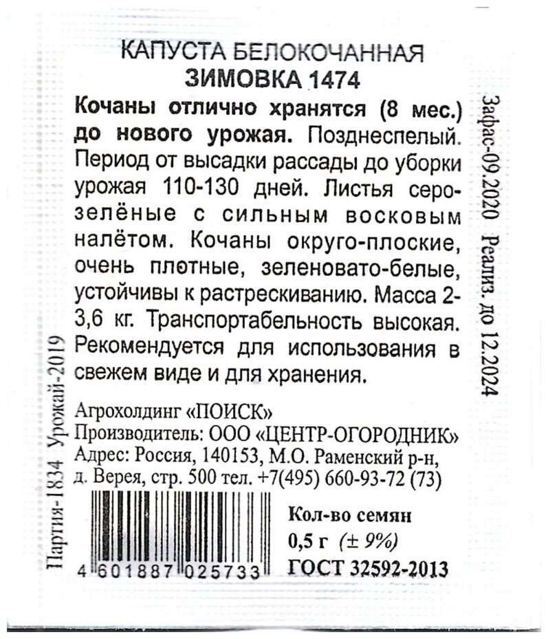Агрохолдинг поиск Капуста белокочанная Зимовка 1474 0,5гр ЧБ 280164 информация:
