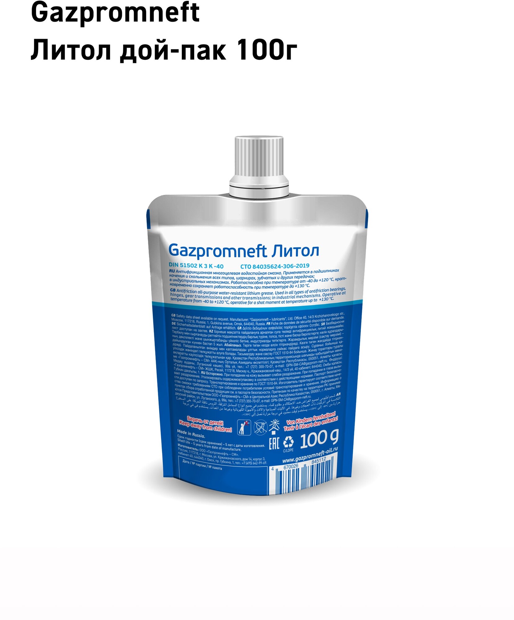 Смазка многоцелевая Gazpromneft литол 100г дой-пак EAN-13: 4650063119995 информация: