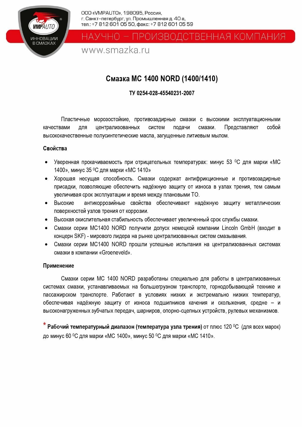 VMPAUTO 1201 Смазка 350 г - Смазка МС 1400 Норд низкотемпературная, картридж