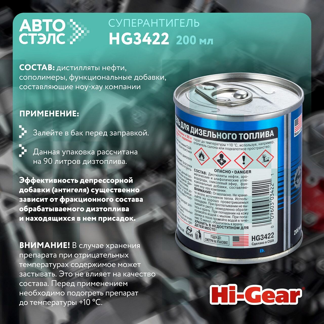 Суперантигель для дизельного топлива Hi-Gear HG3422 200 мл топливная присадка депрессорная присадка информация: