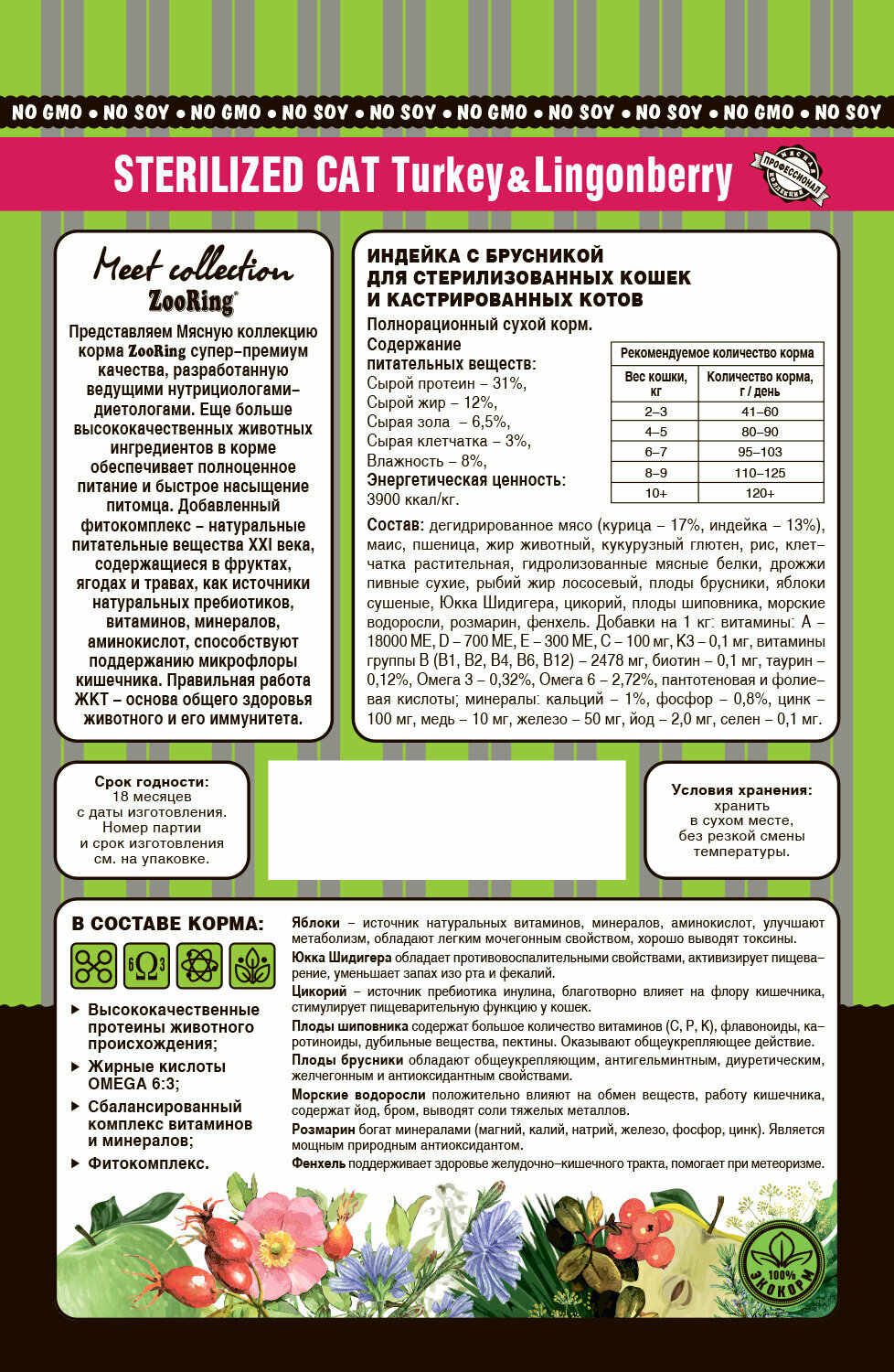 Сухой корм Зооринг / ZooRing Sterilized Cat Turkey & Lingonberry для стерилизованных кошек, индейка с брусникой, 1,5 кг информация: