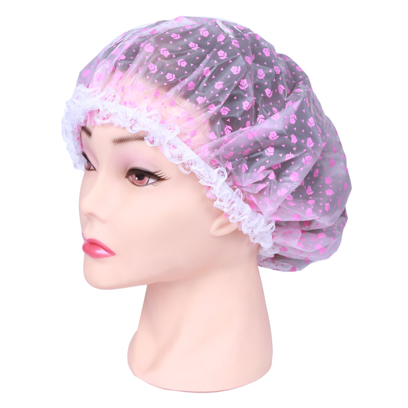 Шапочка Dewal Beauty для душа с кружевом, белая с розовыми цветами (DBH1)