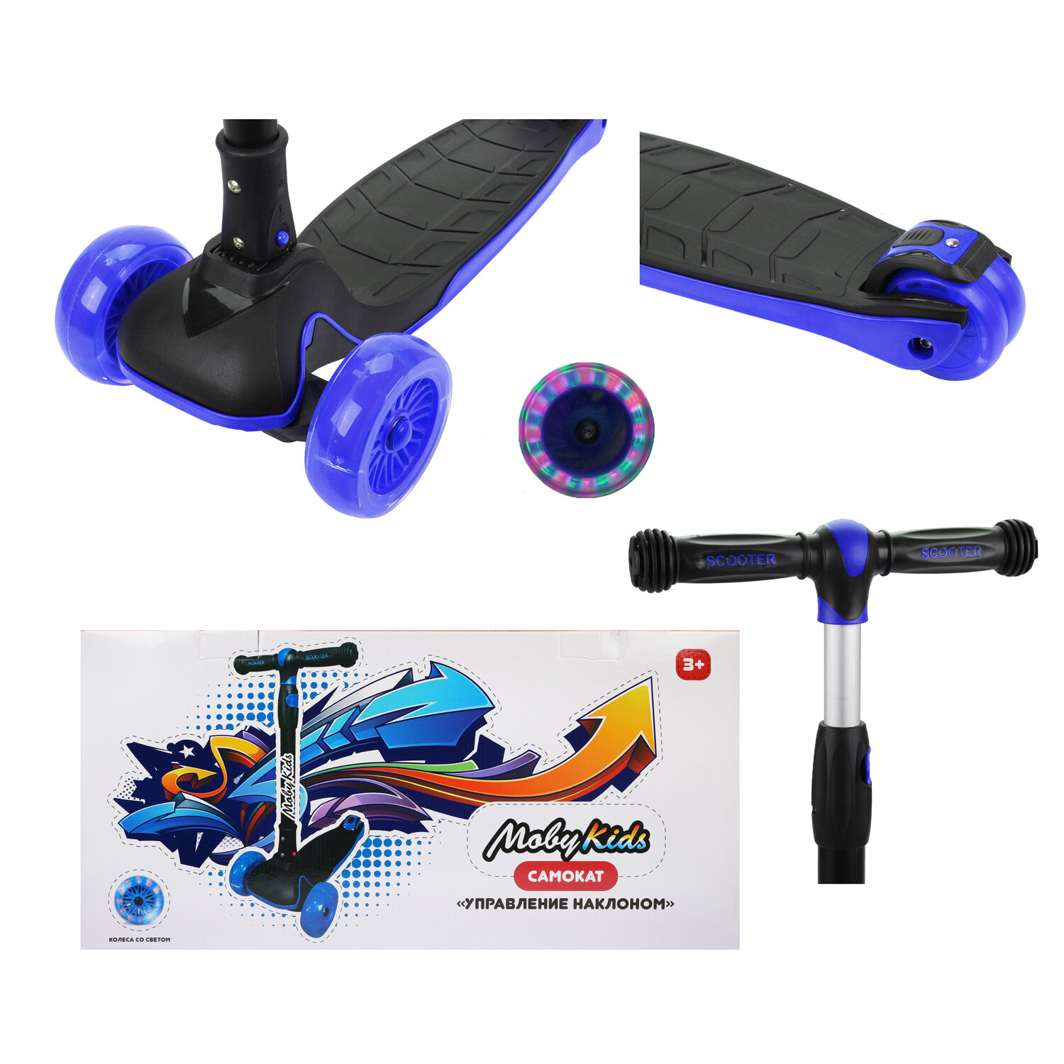Трехколесный складной самокат Moby Kids Runner с широкой декой со светом синий 641279
