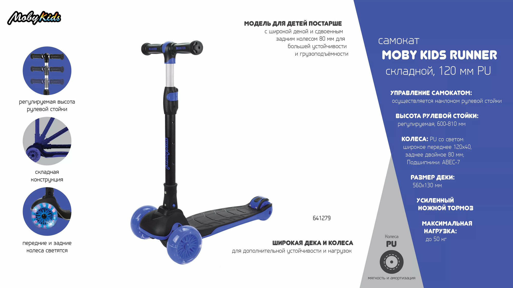 Самокат Moby Kids Runner, складной, широкая дека и колесо, 120 мм PU, свет Moby Kids 641279