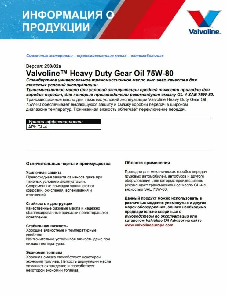 Масло трансмиссионное Valvoline HD Gear Oil 75W-80 5л. (866950) информация: