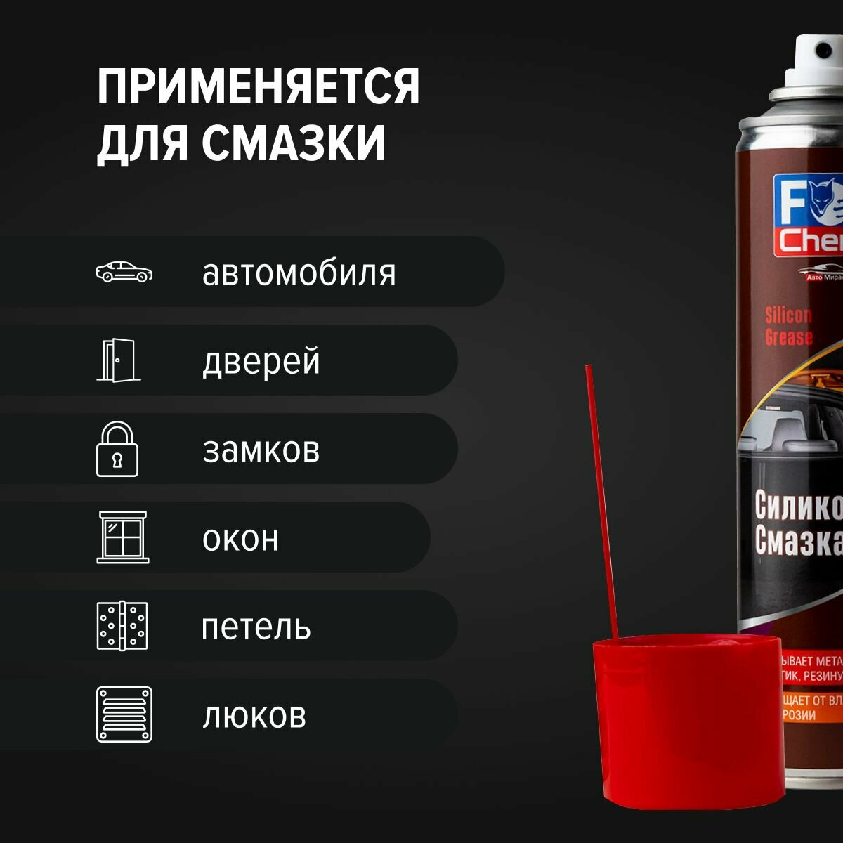 | Область применения | замки и петли / направляющие / резиновые уплотнители / резьбовые соединения / стекло |
