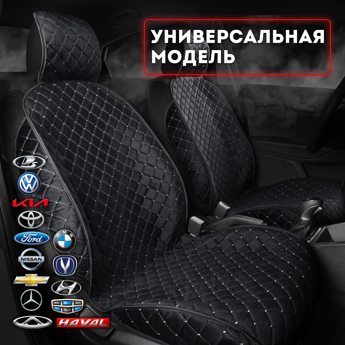 CarCape/ Накидки на сиденья автомобиля из велюра 2 шт. Коплект накидок на передние сиденья. Модель ISTANBUL+ с боками. Чёрный /белая строчка информация: