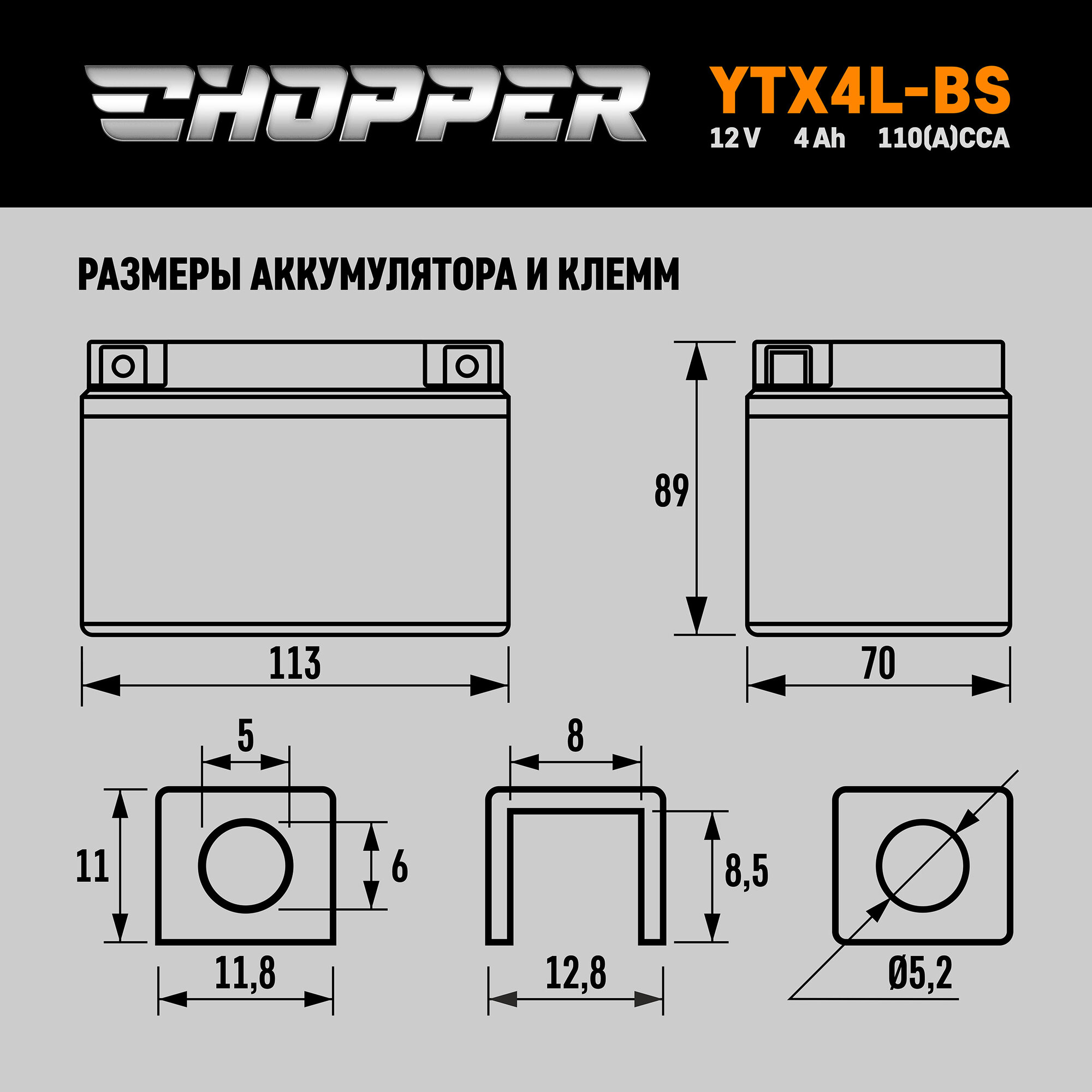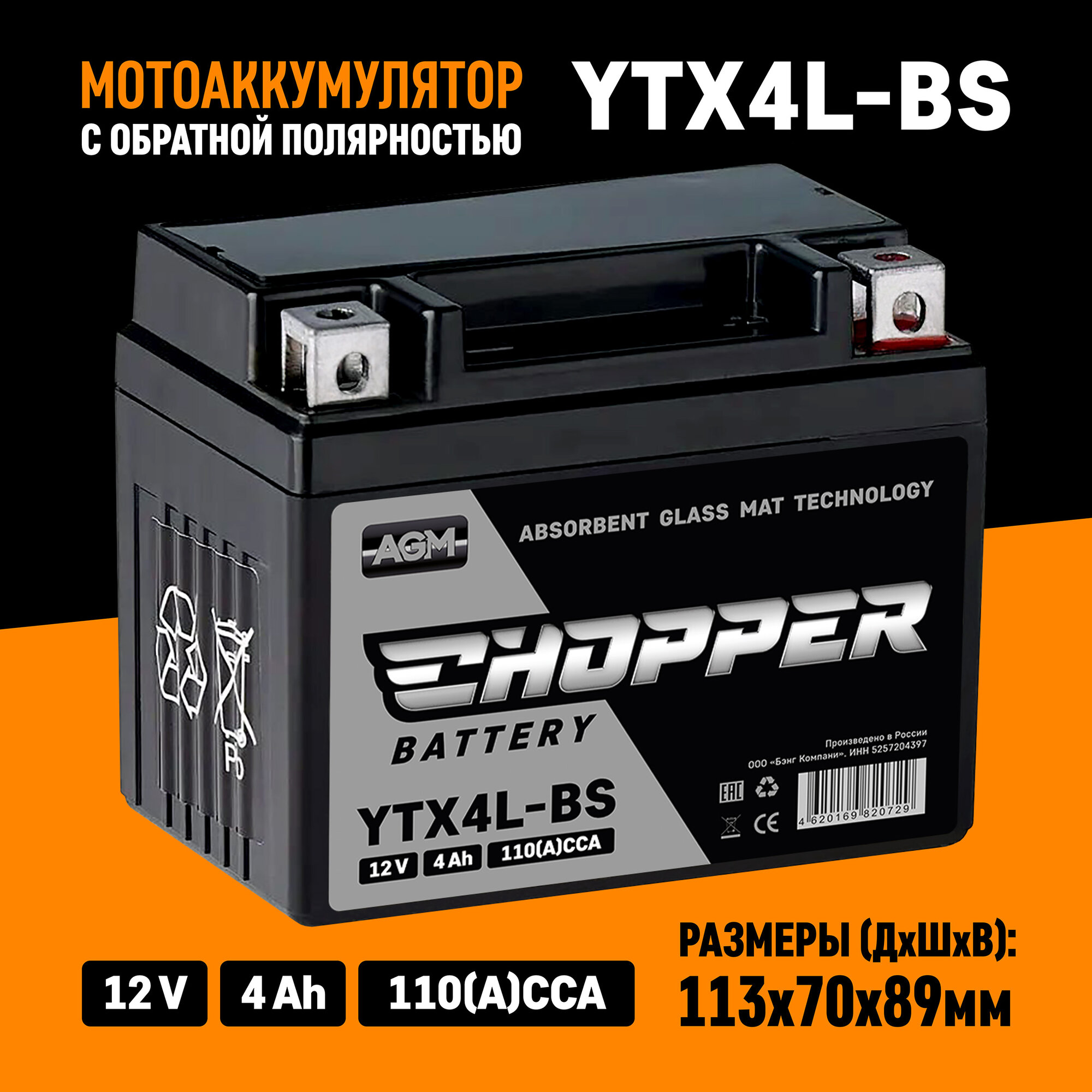 Мото Аккумулятор CHOPPER AGM 12В 4 Ач (YTX4L-BS,YT4L, СТ1204) для мотоцикла, скутера, мопеда, ИБП,UPS 12V 4 Ah информация: