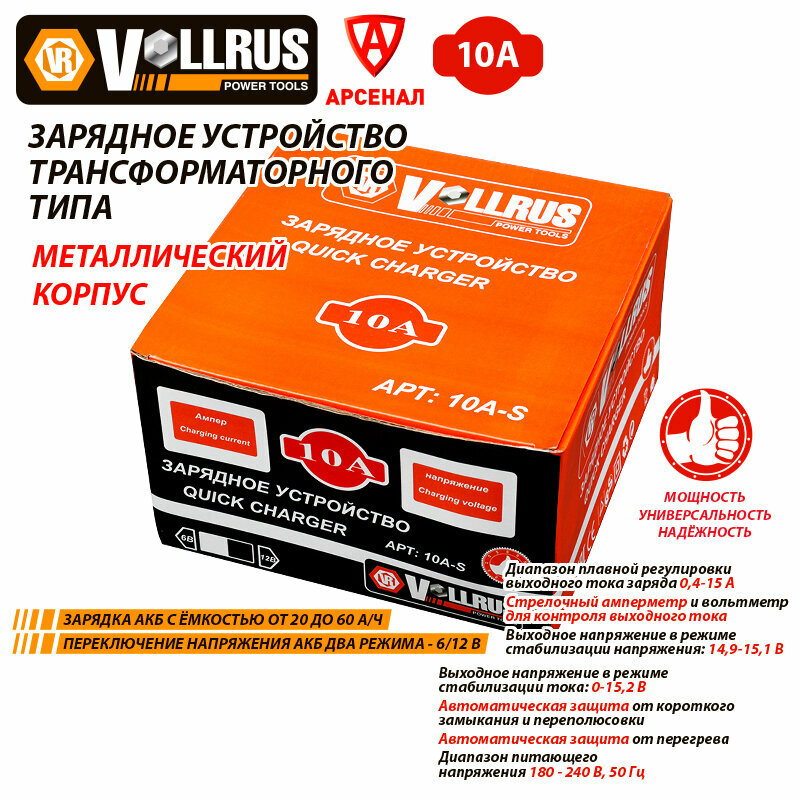 10 цен на Зарядное устройство VOLLRUS (для АКБ 20-60 А/ч), VLR10AS
