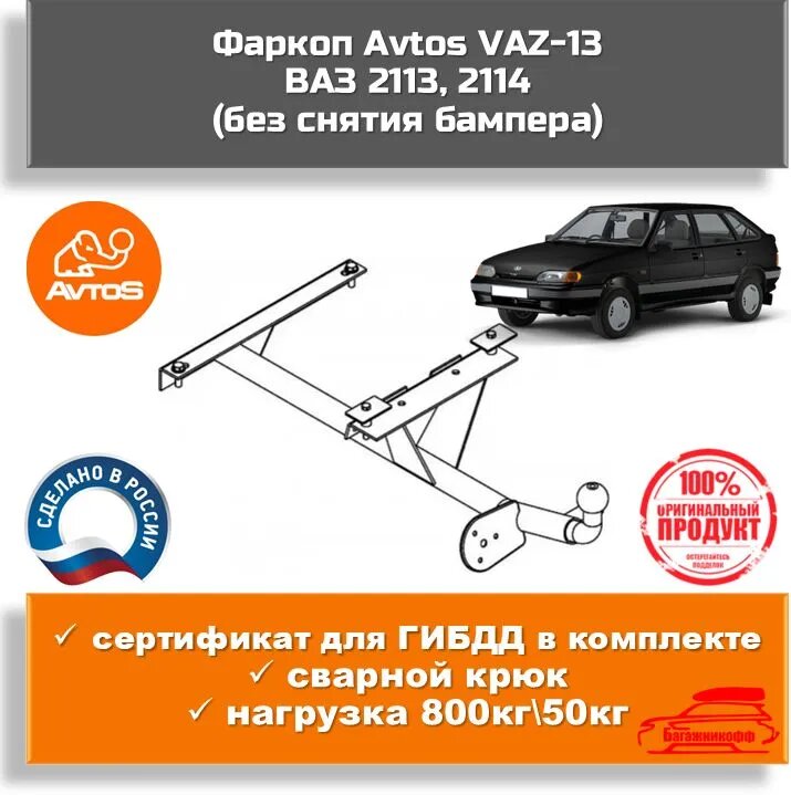 Фаркоп Avtos VAZ-13 для ВАЗ 2113, 2114 (без снятия бампера)(паспорт и сертификат в комплекте) информация: