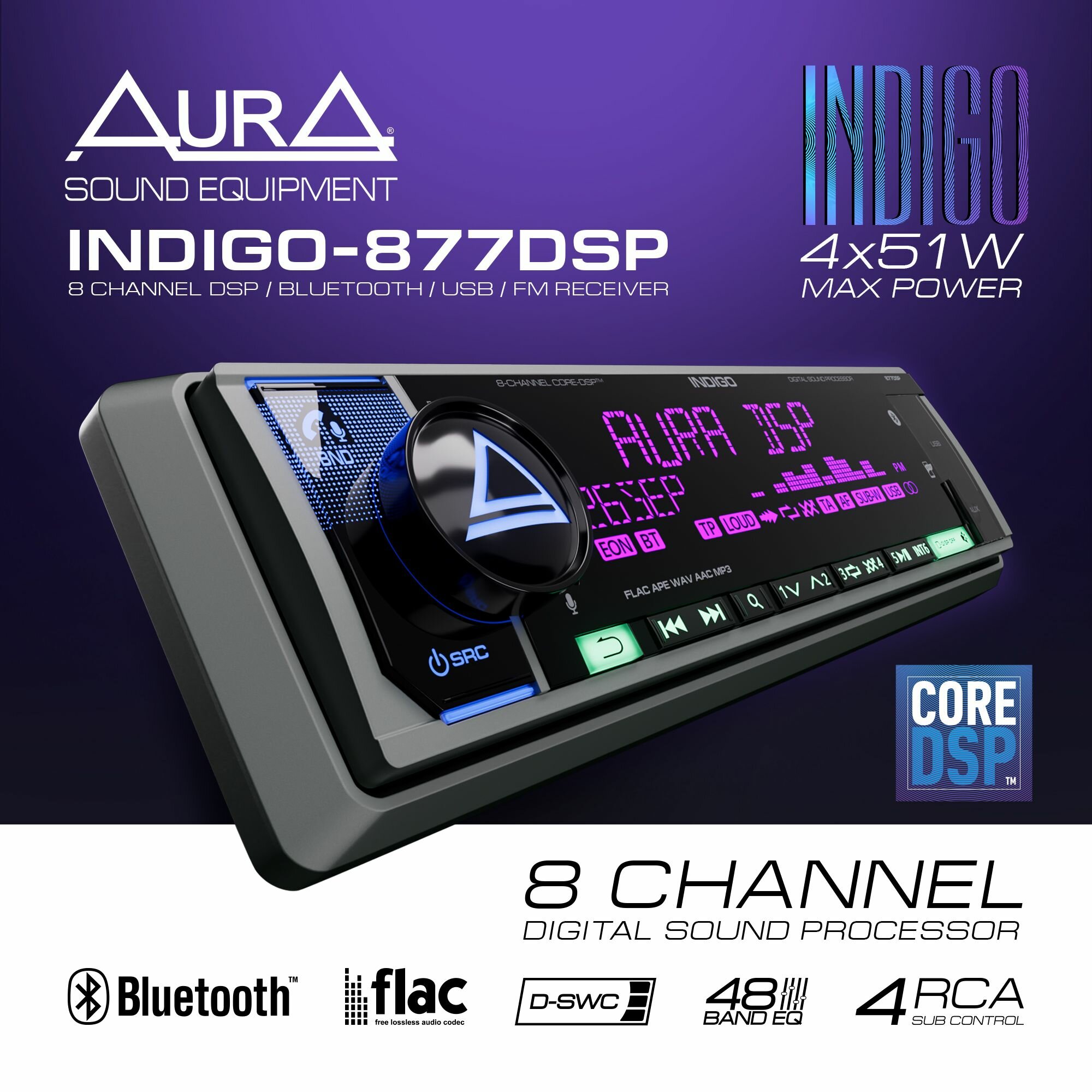 Автомагнитола процессорная AurA INDIGO-878DSP MKII, 1DIN, 8 каналов, Bluetooth, USB, FM, 4x51Вт