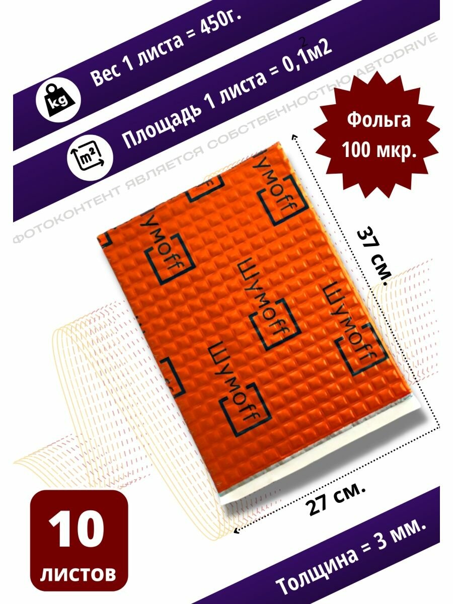 Шумоизоляция для автомобиля Шумофф М3 - 10 листов. Толщина 3 мм. Виброизоляция авто, вибропласт, вибродемпфер, шумка в машину. Шумоизоляция для дверей, крыши, потолка, капота, арок, пола, багажника. Звукоизоляция в авто 3 мм. Шумоизоляция ванны, стояка информация:
