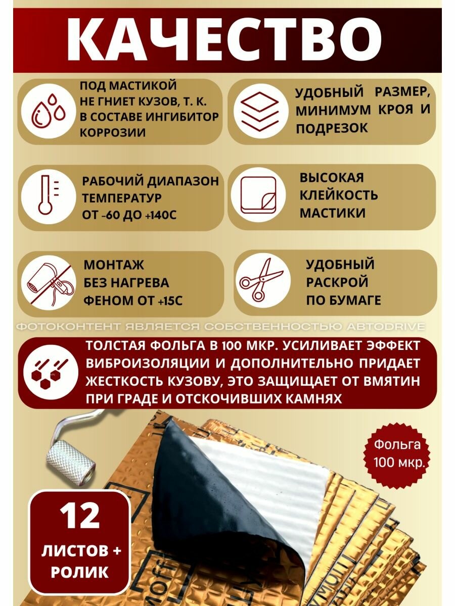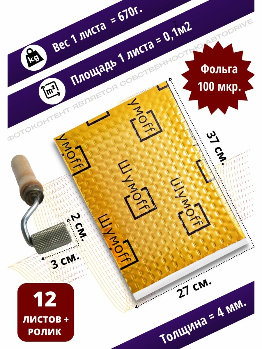 Виброизоляция Шумофф М4, 4 мм. - 4 листа + ролик прикаточный. Шумоизоляция для автомобиля, шумка в авто, вибропласт, вибродемпфер. Шумоизоляция арок, пола, багажника, канализационных труб, стояка, ванны, раковины информация: