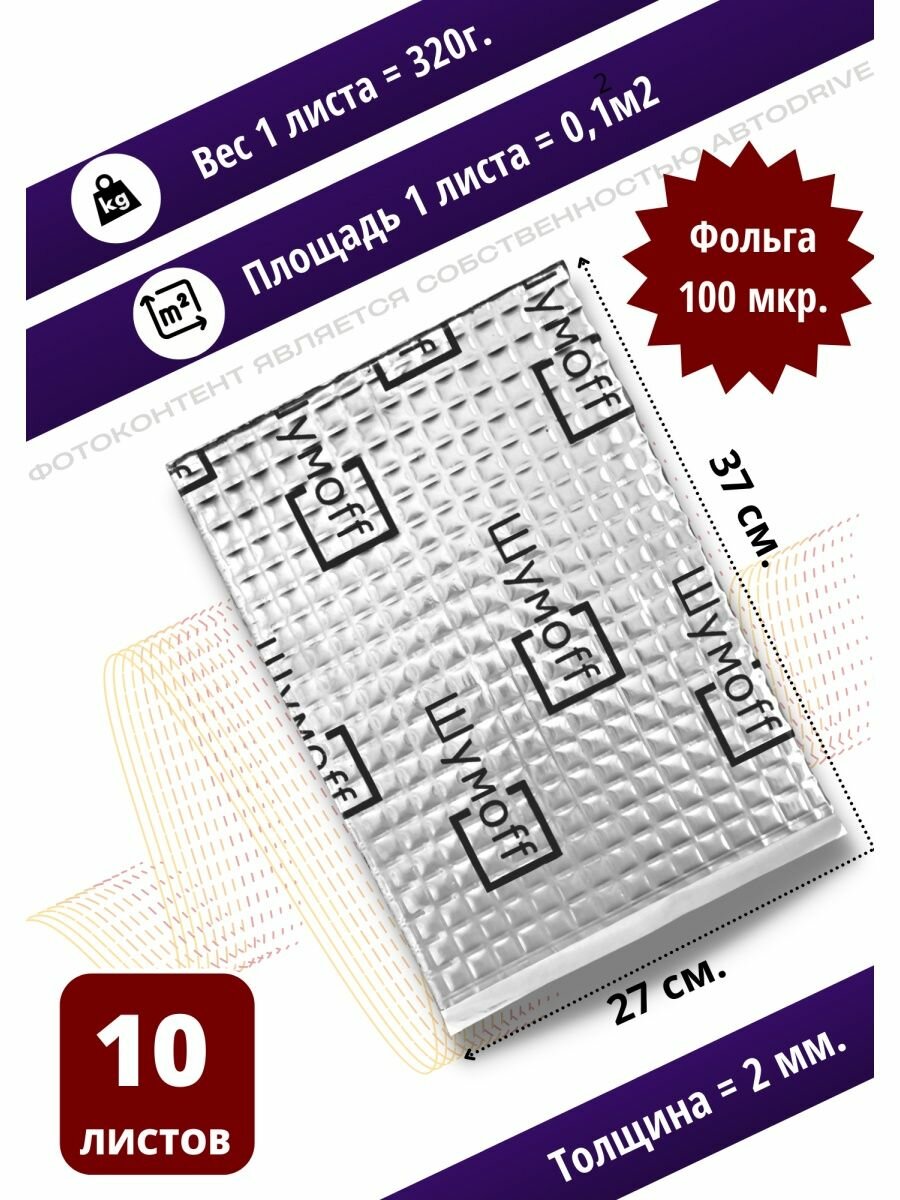 Шумоизоляция для автомобиля Шумофф М2 - 10 листов. Толщина 2 мм. Виброизоляция авто, вибропласт, вибродемпфер, шумка в машину. Шумоизоляция для дверей, крыши, потолка, капота, локеров. Звукоизоляция в авто Шумоff 2 мм. Шумоизоляция ванны, отлива информация:
