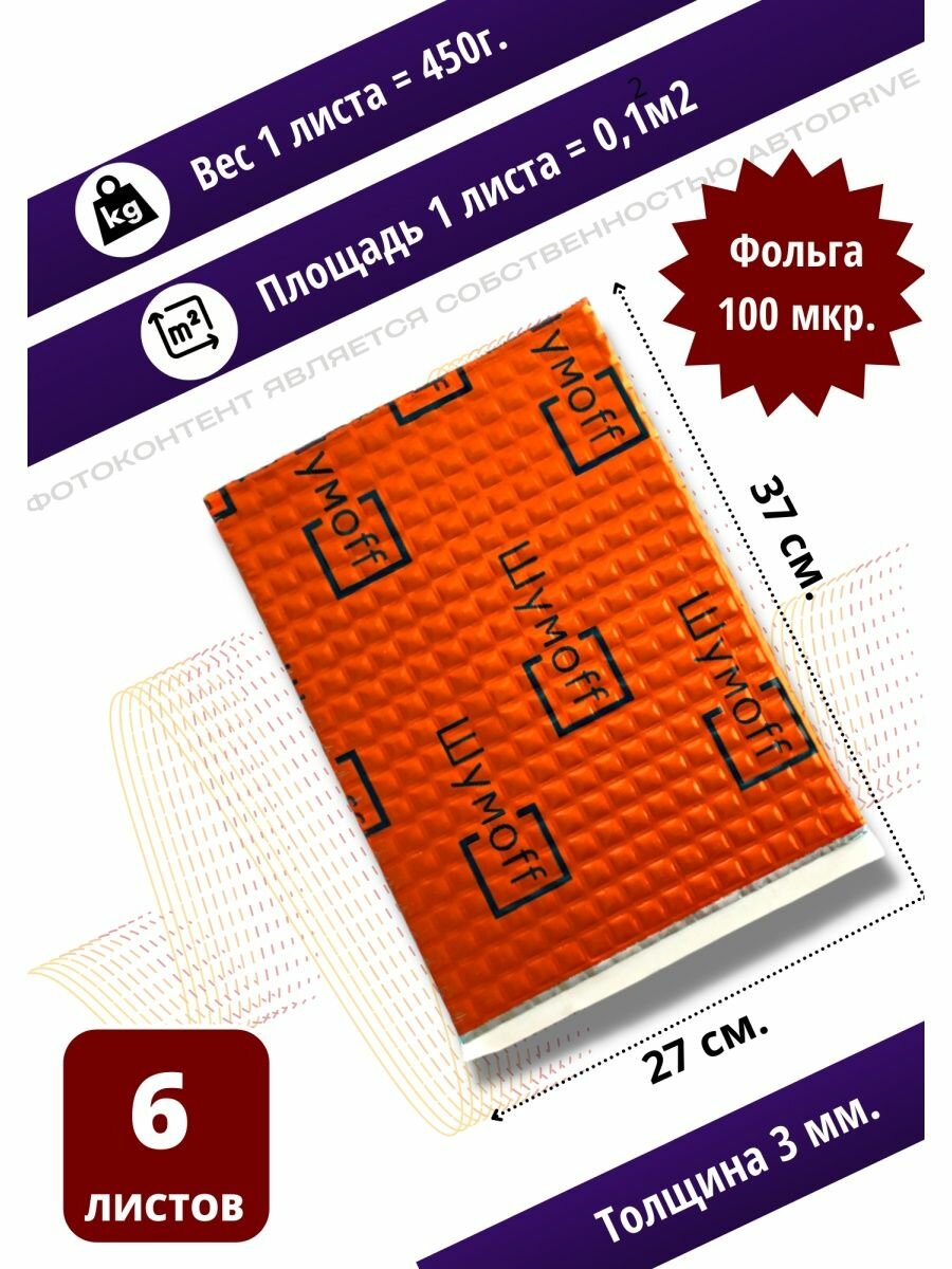 Шумоизоляция для автомобиля Шумофф М3 - 6 листов. Толщина 3 мм. Виброизоляция авто, вибропласт, вибродемпфер, шумка в машину. Шумоизоляция для дверей, крыши, потолка, капота, арок, пола, багажника. Звукоизоляция в авто 3 мм. Шумоизоляция ванны, стояка информация: