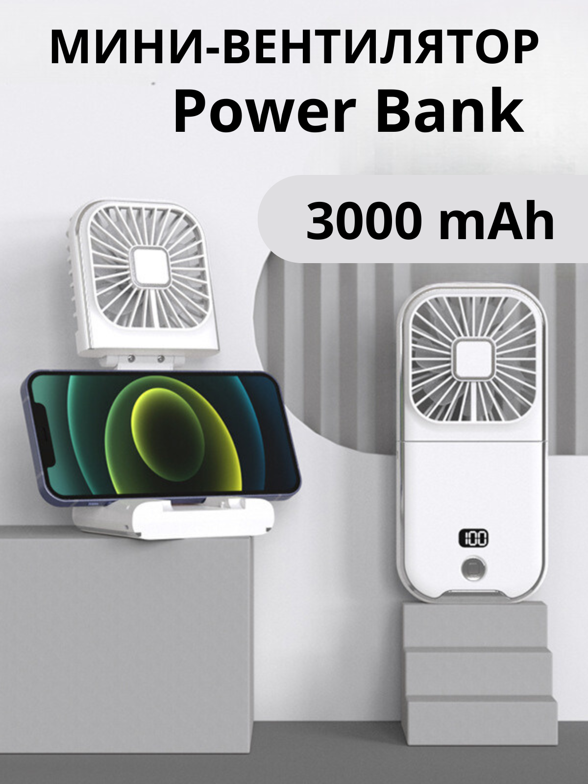 Вентилятор Power bank, складной, портативный, 5 скоростей работы, 3000 мАч, белый