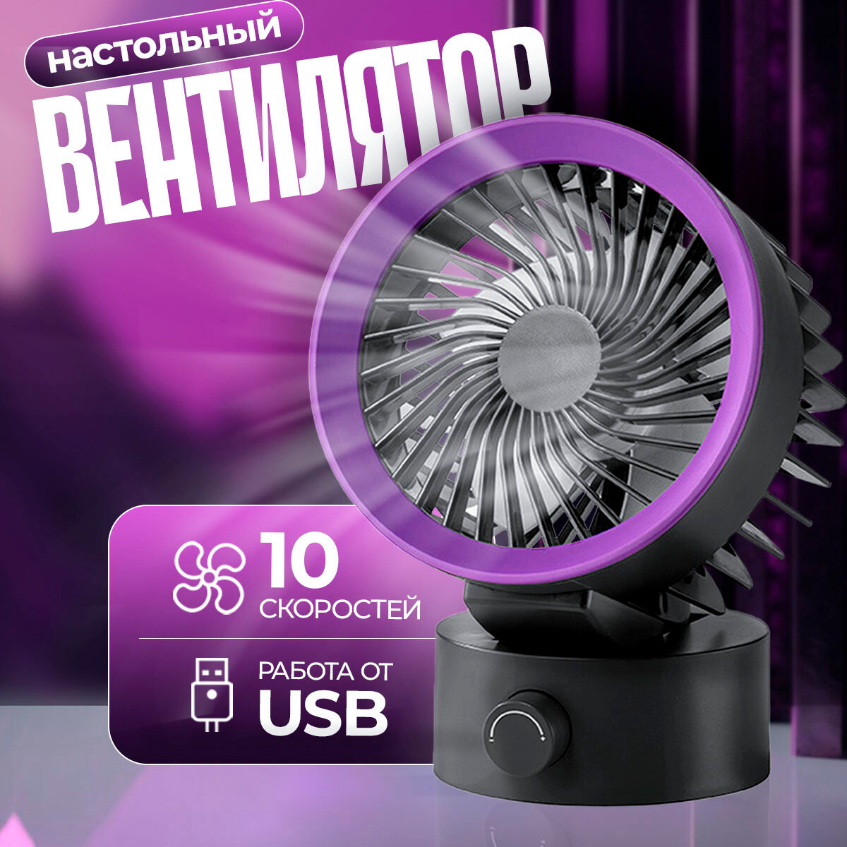 Отзывы на Вентилятор USB настольный лопастной регулируемый NAS-1 Черный/фиолетовый