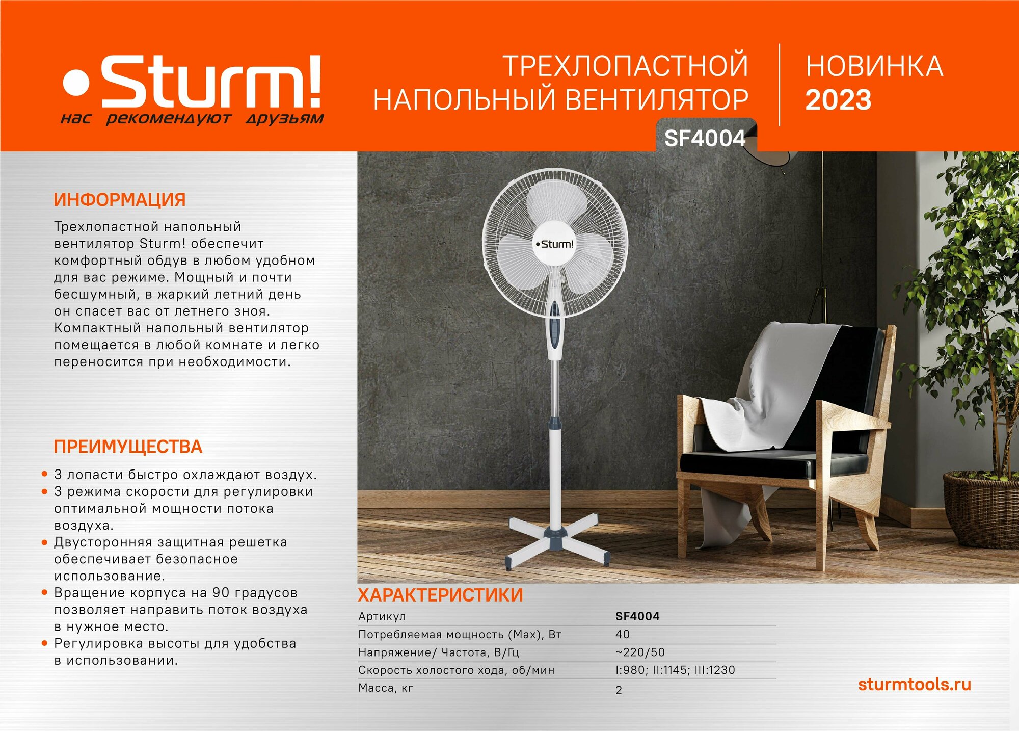Вентилятор напольный 40Вт, диаметр 40 см, 3 режима Sturm SF4004 информация: