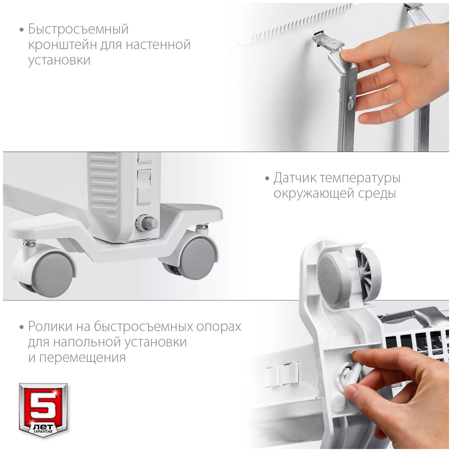 | Подробная комплектация | Конвектор электричческий 1 шт; Крогштейн 1 шт; Ролик 4 шт; Опора 2 шт; Набор крепежа 1 шт; Руководство по эксплуатации 1 шт; |