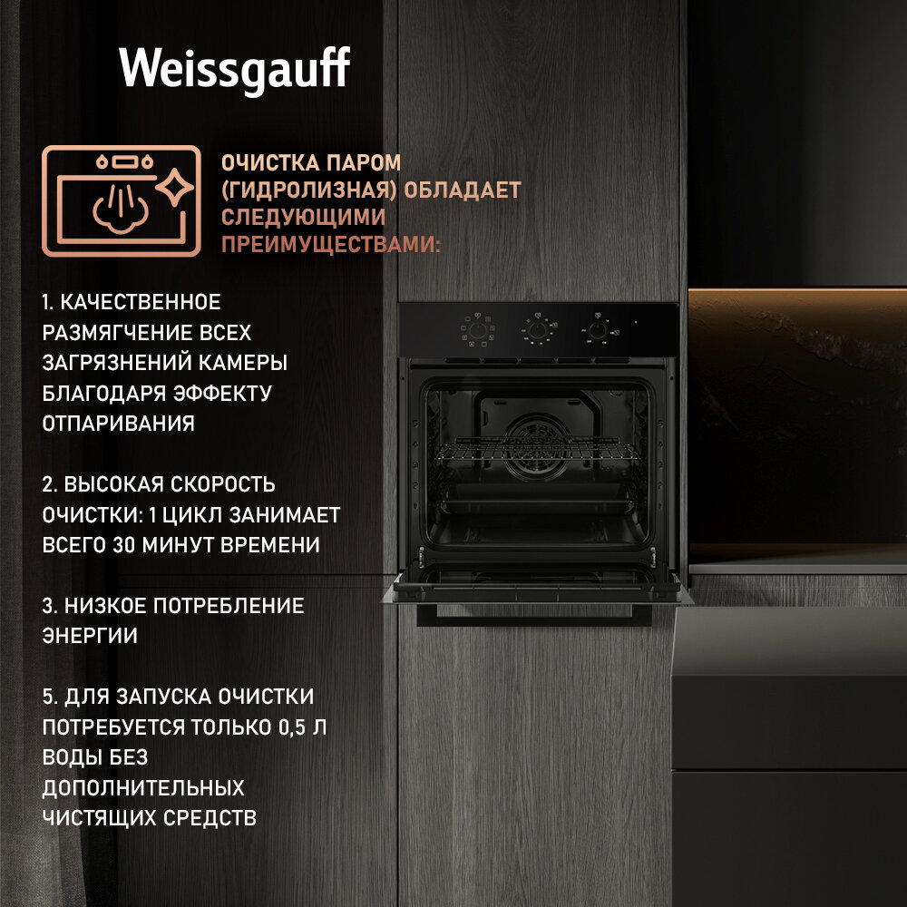 Духовой шкаф Weissgauff EOM 208 PDB Steam Clean с Конвекцией, 3 года гарантии, большой объём 65 л, утапливаемые рукоятки, двойное стекло дверцы, 8 функций, таймер, гидролизная очистка, эмаль легкой очистки информация: