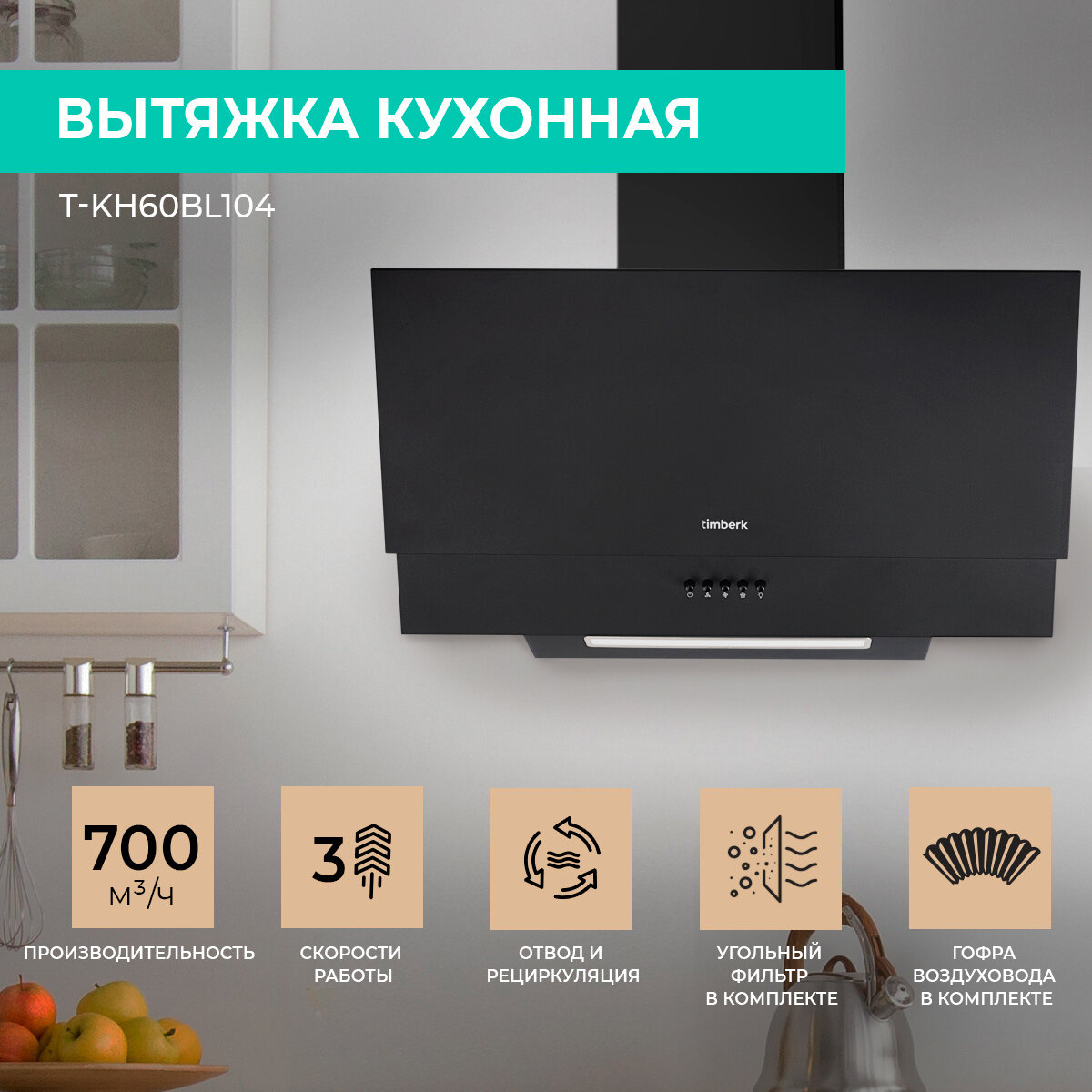 Вытяжка кухонная наклонная Timberk T-KH60BL104 информация: