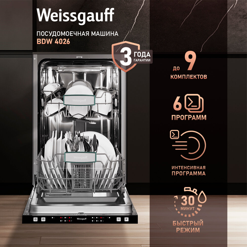 10 цен на Встраиваемая посудомоечная машина Weissgauff BDW 4026,3 года гарантии, 9 комплектов посуды, 6 программ, Интенсивная, Эко, Стекло, Универсальная, 90 минут, Быстрая 30 минут, таймер, индикатор соли и ополаскивателя, электронное управление, дозагрузка посуды
