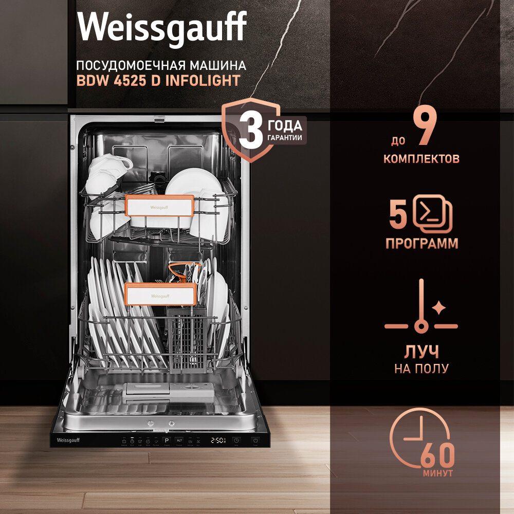 10 цен на Встраиваемая посудомоечная машина с лучом на полу Weissgauff BDW 4525 D Infolight, 3 года гарантии, 9 комплектов посуды, 5 программ, половинная загрузка, дополнительная сушка, индикаторы соли и ополаскивателя, энергоэффективность А+++