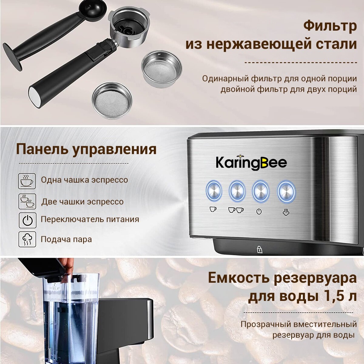 Отзывы на Рожковая кофемашина KaringBee CM3010 20 бар/мощность 1050 Вт/из нержавеющей стали/стабильная температура 92C,