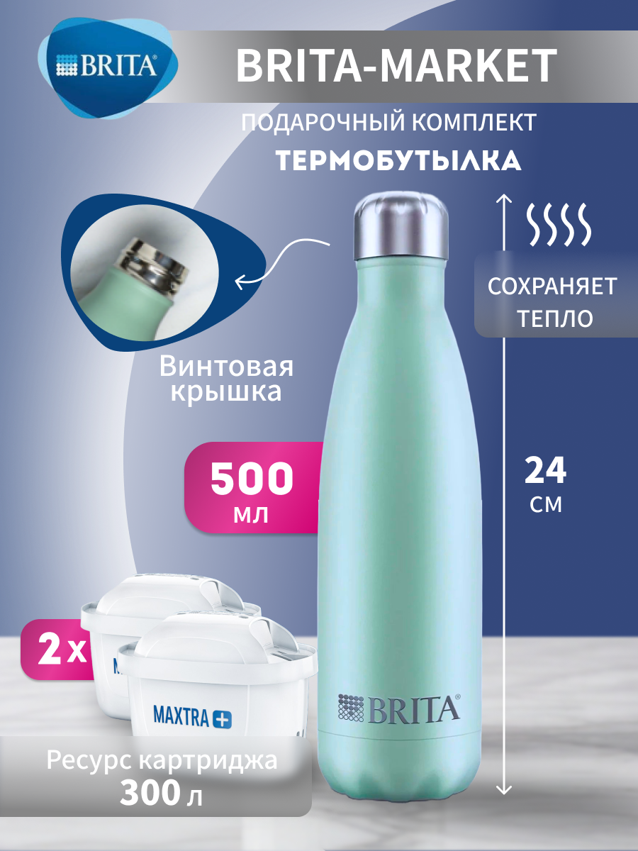 Фильтр - кувшин для воды BRITA Marella синий 2,4 л и 2 картриджа MAXTRA+ и термобутылка 0,5 л информация: