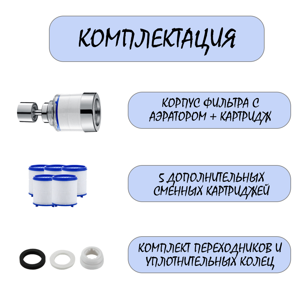 Фильтр-насадка для воды на кран с поворотным аэратором , очищает воду от ржавчины, вредных примесей и умягчает, 5 дополнительных картриджей информация: