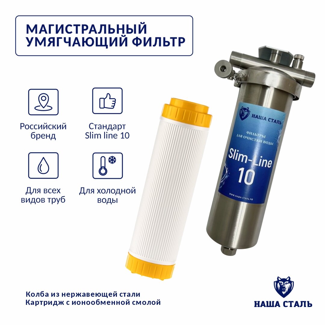 Фильтр из нержавеющей стали магистральный умягчающий наша сталь Slim-Line 10 информация: