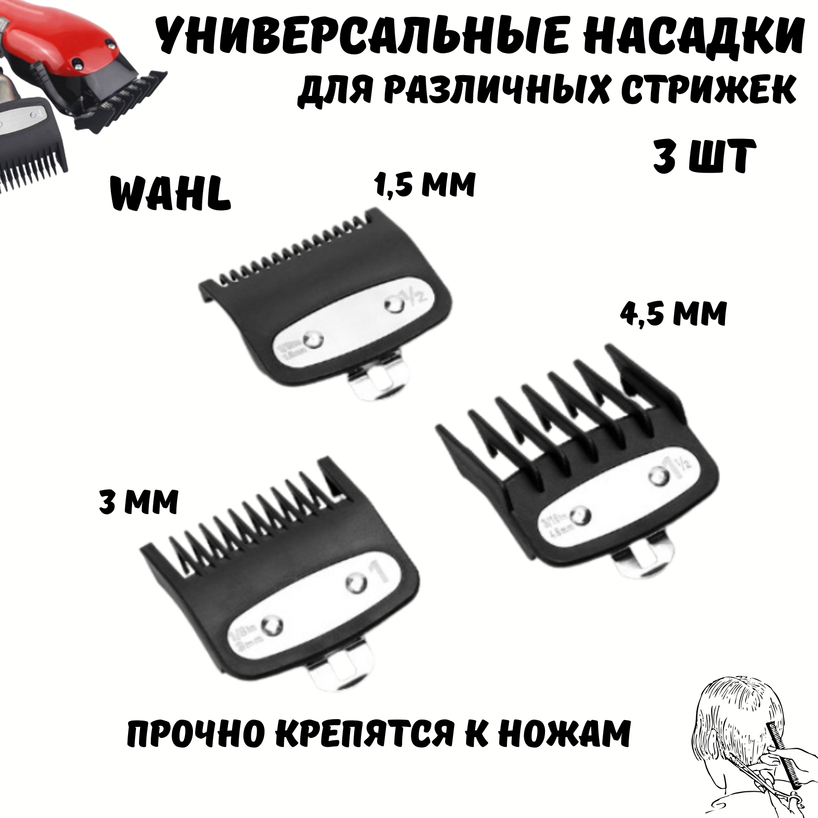 Отзывы на Насадки на машинку для стрижки волос, насадки на триммер Wahl, 3 шт, 1,5; 3; 4,5 мм