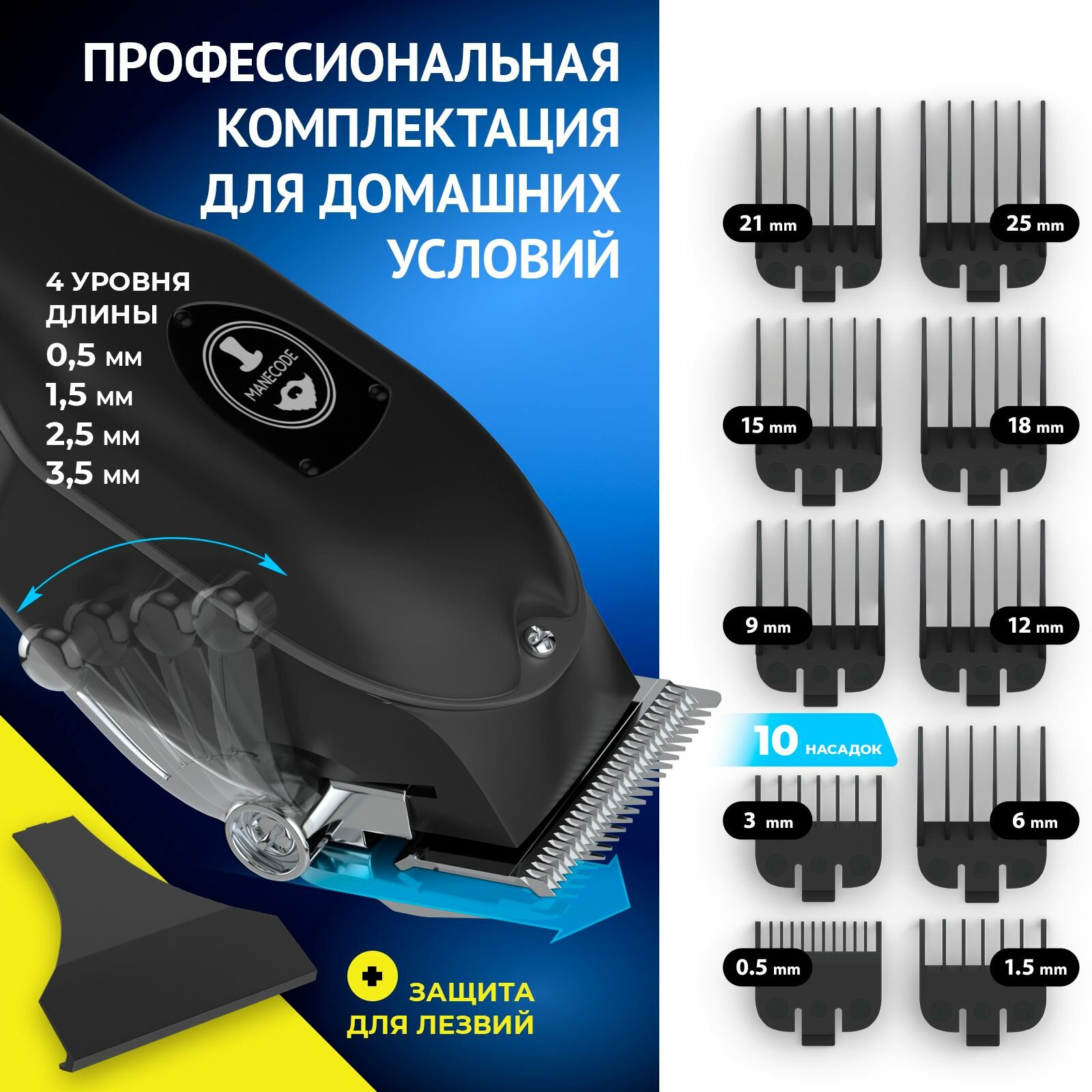 10 цен на Машинка для стрижки волос Manecode EXCALIBUR c 10 насадками от 0,5 до 25 мм и зарядной станцией - Профессиональные твердосплавные самозатачивающиеся регулируемые лезвия - Фирменный фартук в комплекте