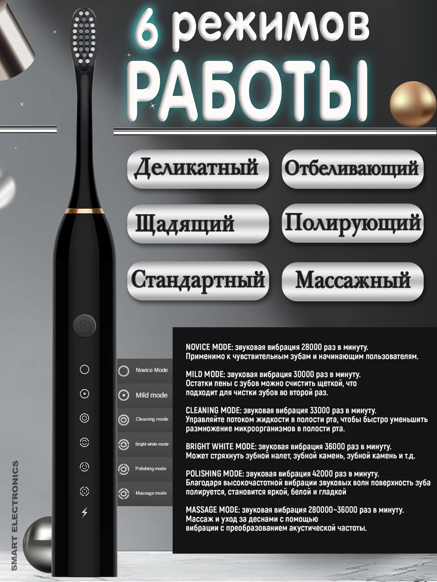 Зубная щетка электрическая, звуковая электрощетка, с зарядкой и насадками, для взрослых и детей, черный информация: