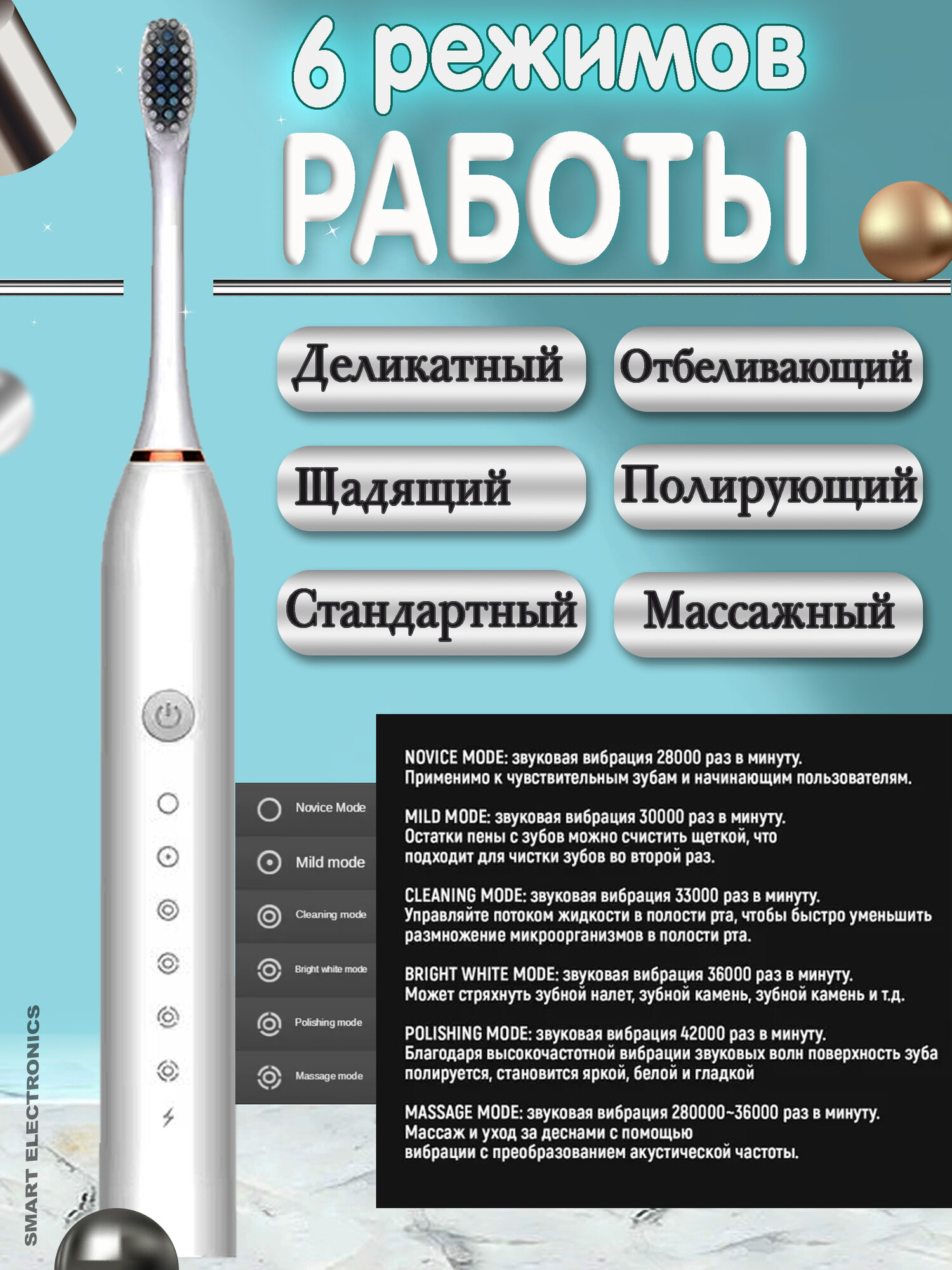 Зубная щетка электрическая, звуковая электрощетка, с зарядкой и насадками, для взрослых и детей, белый информация: