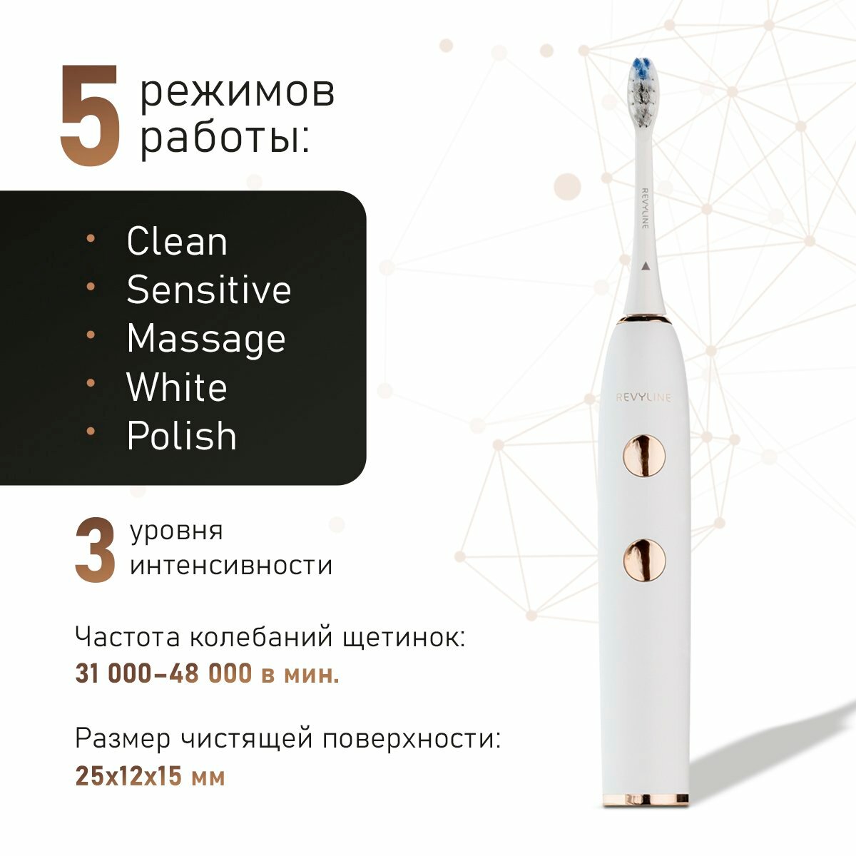 Электрическая зубная щетка Revyline RL085, 5 режимов, 3 насадки, IPX8, белая