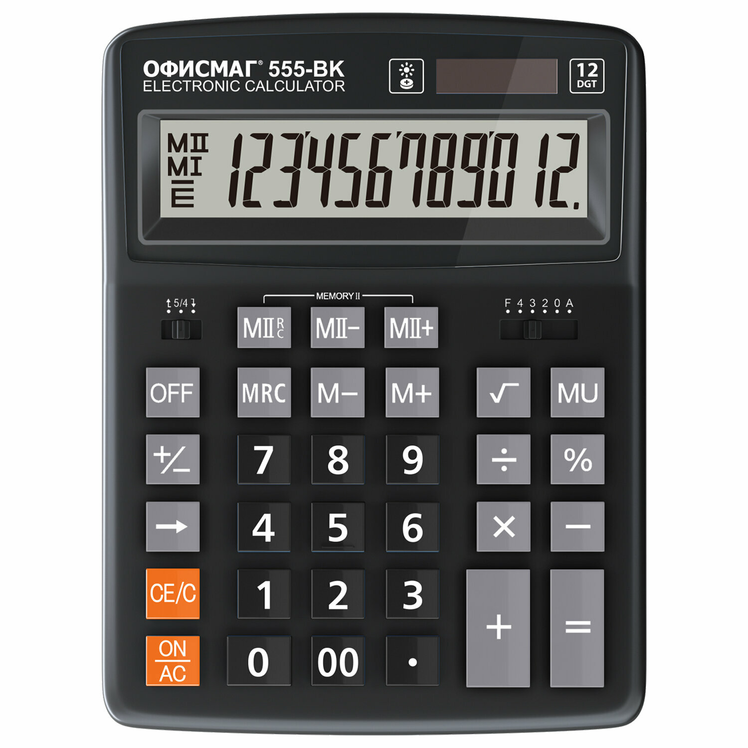 Калькулятор настольный большой 12 разрядный, 206x155 мм, двойное питание, черный, Офисмаг 555-BKBU, 271927