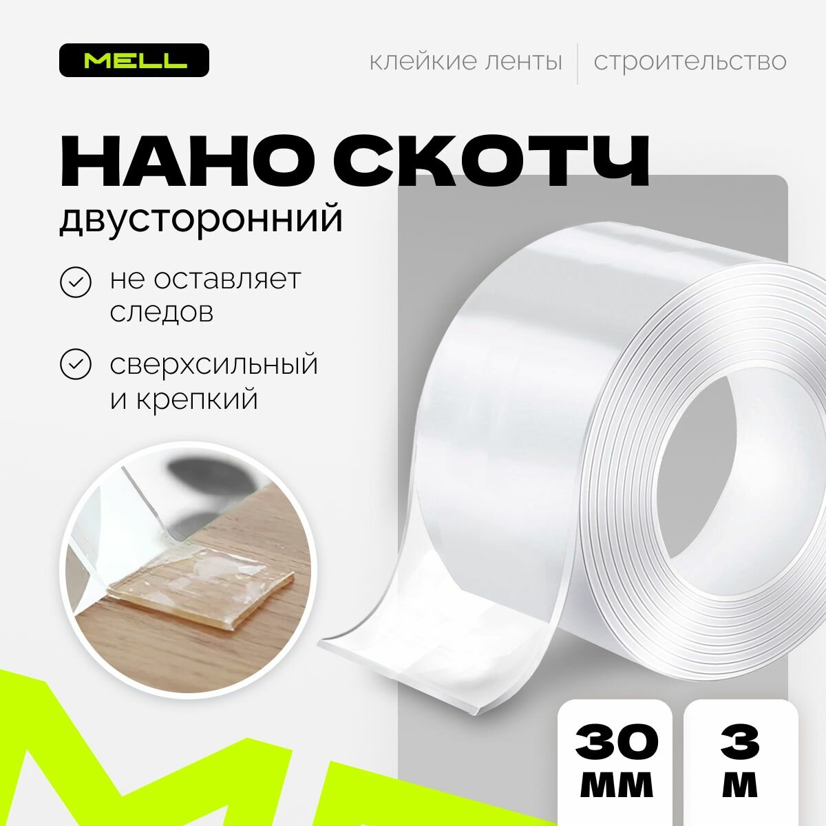 Нано скотч двухсторонний MELL прозрачный многоразовый 3 м, 30 мм / тонкая клейкая лента для фиксации на различных поверхностях / самоклеящаяся гибкая полоска информация:
