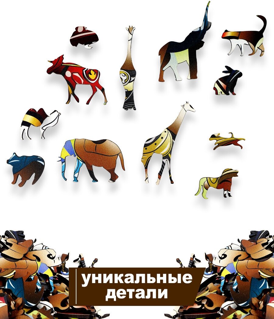 Пазл деревянный фигурный объемный 100 элементов в форме животных для детей и взрослых PuzzleHome на подложке