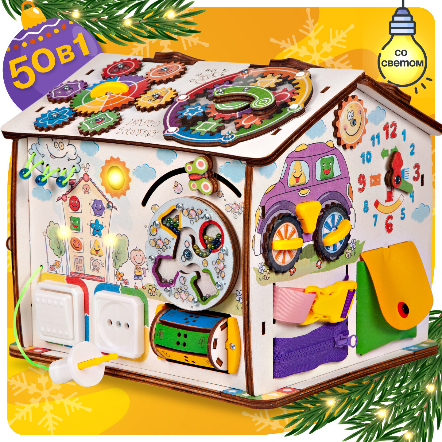 10 цен на Бизиборд развивающий домик Evotoys Смайлики в машинке 25х29 см со светом