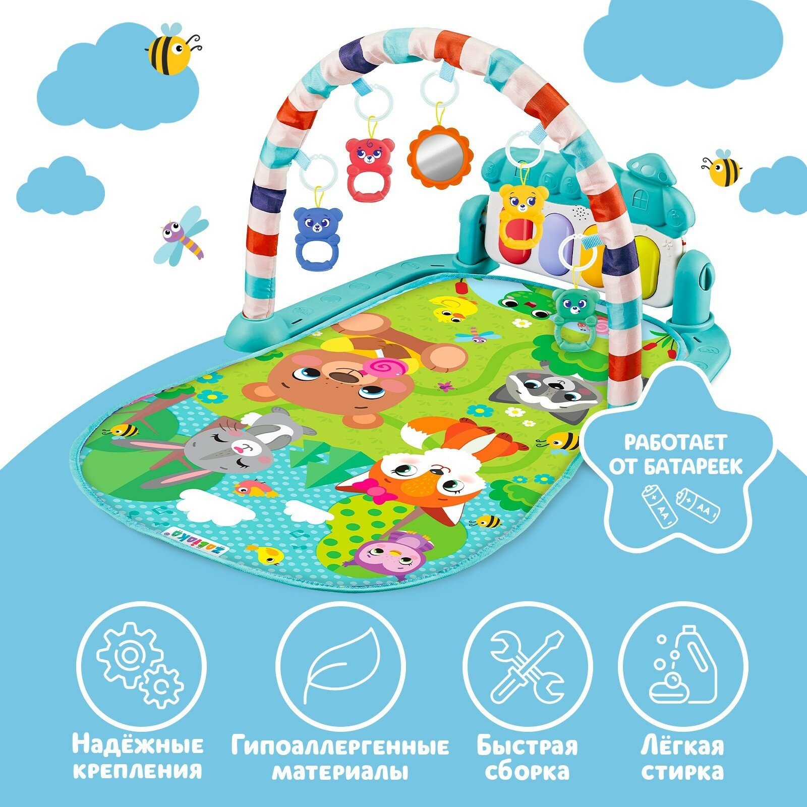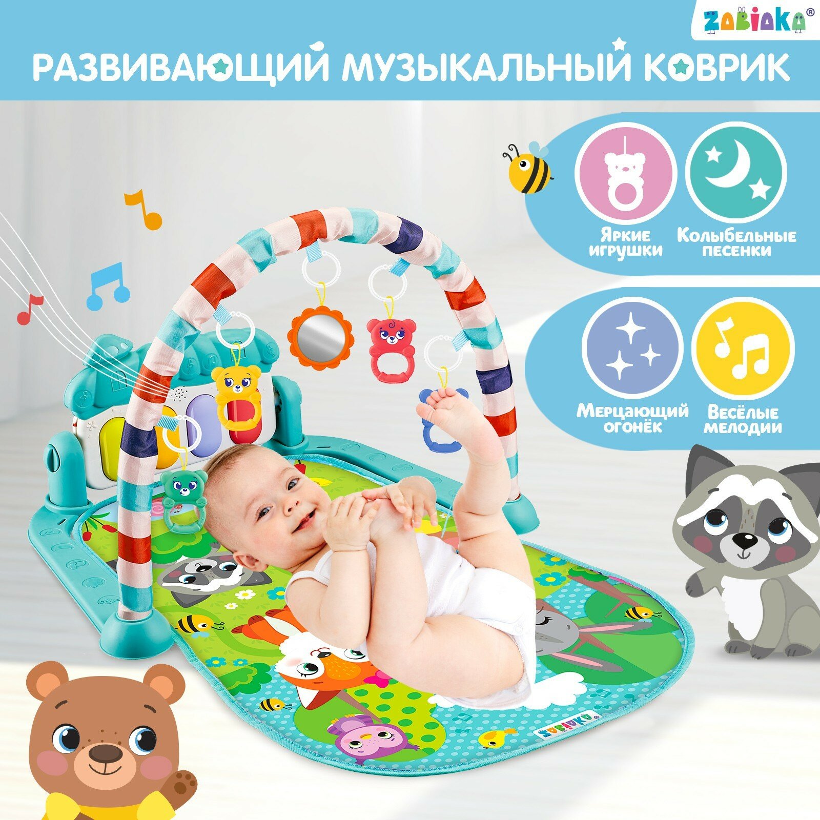 Музыкальный развивающий коврик «Милые зверята», русское озвучивание, цвет голубой информация: