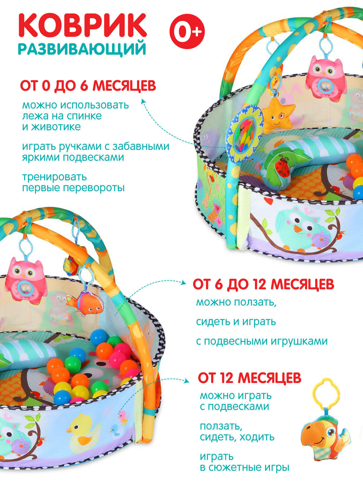 | Комплектация | коврик / 2 дуги / 5 подвесок-игрушек / зеркальце / подушка / 30 мячиков |