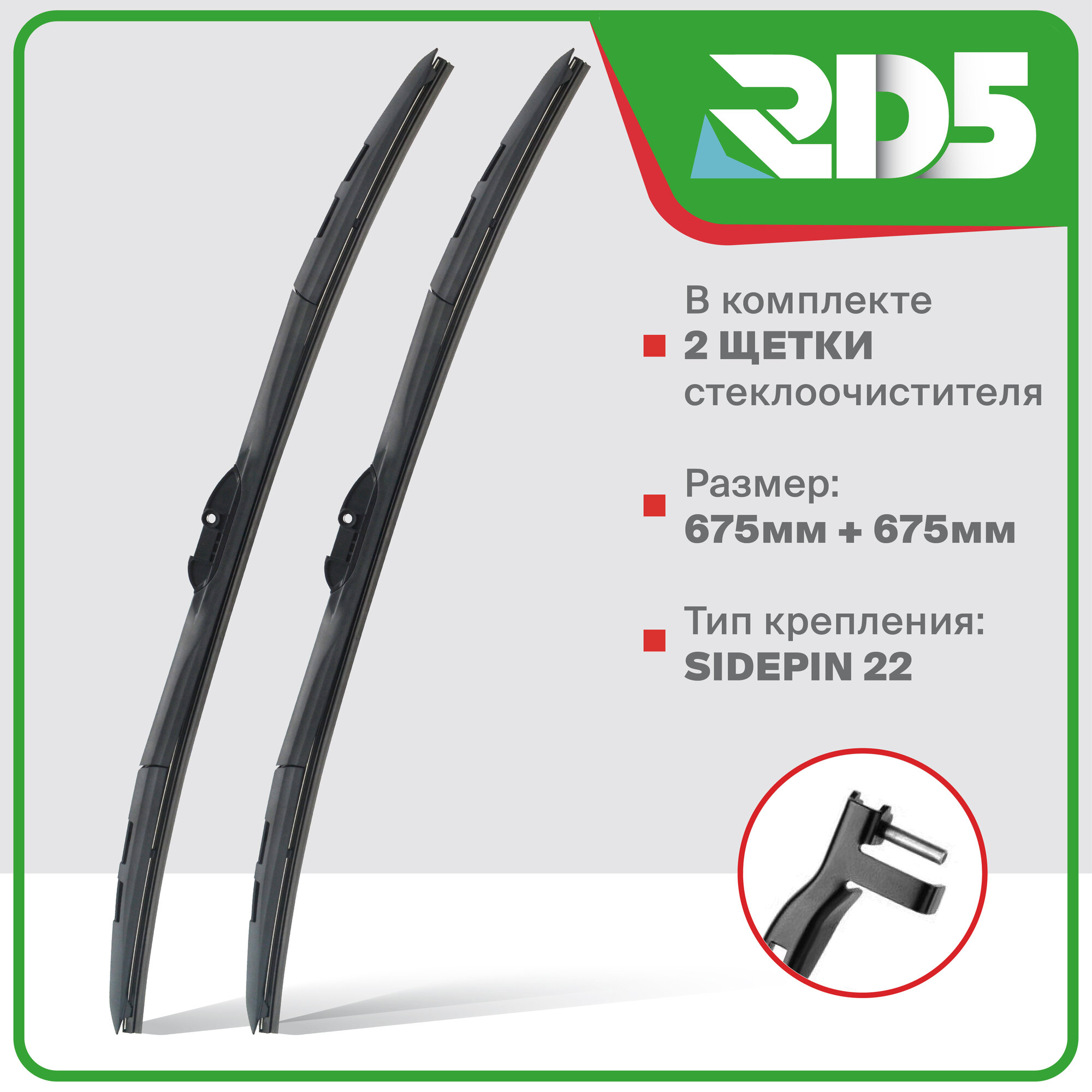| Подробная комплектация | Комплект гибридных щеток стеклоочистителя RD5 650 650 мм. Крепление Side pin 22. |
