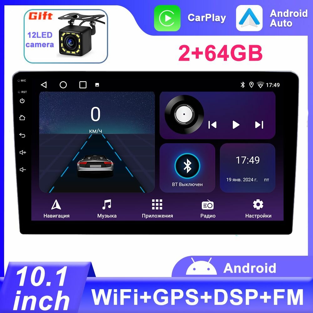 2 din 2+64G Android 10.1 дюймов GPS,Bluetooth,Wi-Fi,FM-радио,Магнитола в Авто,Магнитола для авто с экраном,Carplay,Android auto информация: